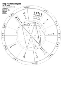 Hammarskjöld werd geboren om 11:30 op 29 July 1905 in Jönköping, Zweden (overleden 18 September 1961 in Zambia). Het geboortetijdstip is niet van de hoogste standaard binnen de astrologie. Maar zelfs zonder zekerheid omtrent zijn ascendant leest zijn geboortetekening astrologisch gezien zo helder als glas. We zien een grote rechthoek tussen Saturnus/Zuidelijke Maansknoop, Uranus, Mercurius/Noordelijke Maansknoop en Juno. Dit soort symmetrische figuren wijzen vaak op een groot talent, omdat een groot deel van de planeten (stukjes van de persoonlijkheid) samenwerken om tot één doel te komen. Juno staat bovendien in het centrum van een rijtje planeten: Venus, Pluto, Juno, Maan en Neptunus. Zo’n rijtje heet een Stellium en is ook aan een aanwijzing van een bundeling van krachten, er ontstaat als het ware een planetair focuspunt. Belangrijk aan dit Stellium is dat Pluto als het ware naar de samenwerking met Saturnus wordt getrokken. Pluto- Saturnus-aspecten zie je vaak bij politici. Het geduld, de controle, de autoriteit, het verantwoordelijkheidsbesef en het besef van de grote structuren (Saturnus) krijgen impact door de power en het intense machtsverlangen van Pluto. Bij Dag kun je daar diplomatie (Venus), de gave van het woord (Mercurius), het aanvoelen van het volk en de tijd (Uranus) en invoelend vermogen (Maan en Neptunus) aan toevoegen. Dan ben je niet alleen een kundig bestuurder, maar ook iemand met een hart en een geweten.