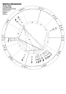Kunstenares Marina Abramović (77) was samen met haar ex-partner Ulay (Frank Uwe Laysiepen, 1943-2020) in de jaren zeventig grondleger van een nieuw soort performancekunst. Bezoekers moesten zich bijvoorbeeld tussen een naakte Marina en Ulay doorwurmen om een museum te betreden. Of Marina sneed een communistische ster in haar buik, schrobde urenlang bebloede botten schoon of at huilend een rauwe ui (voice-over: ‘I am tired of always falling for the wrong man.’). Kunst die fysiek, langdurig, confronterend en mentaal veeleisend was, volgend de website van het Stedelijk Museum te Amsterdam. Naast kunstenares is Marina Abramović ook spiritueel medium. Dat laatste vráágt natuurlijk om een astrologische interpretatie. Abramović werd volgens de website van Astrotheme geboren op 30 november 1946, om 19:15 te Belgrado (Servië).